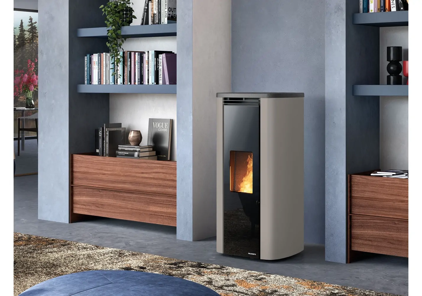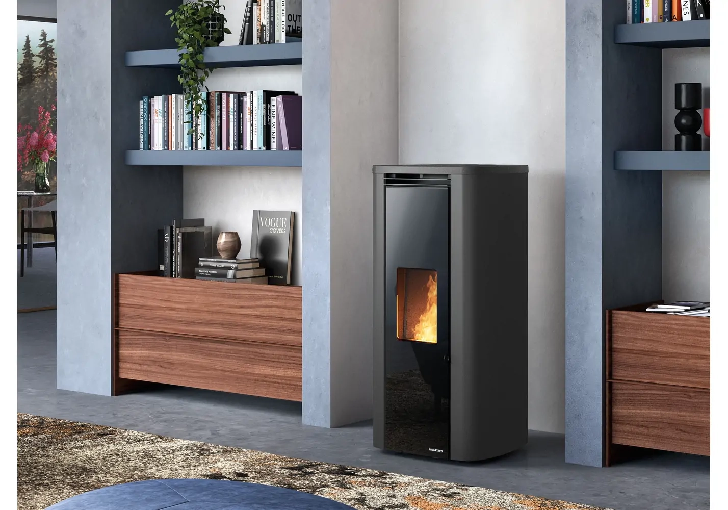 Poêle à granulés Ecofire Theo 6 au design élégant et aux formes douces, conçu pour offrir un chauffage performant et confortable.