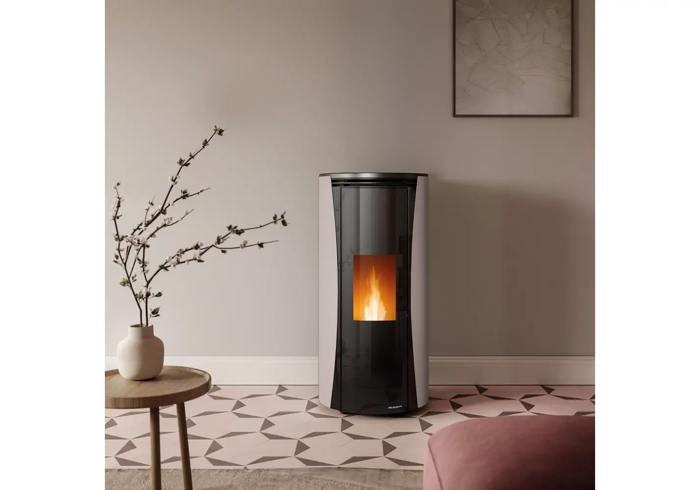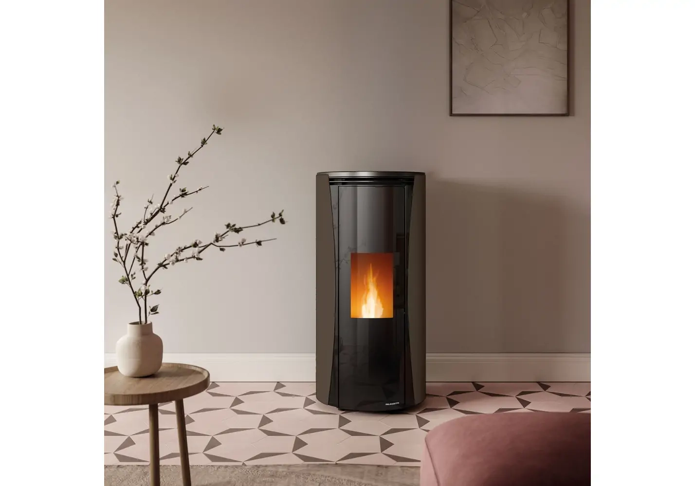 Poêle à granulés Ecofire Vivi 6 au design rond élégant, conçu pour offrir un chauffage performant tout en apportant une touche contemporaine à votre intérieur.